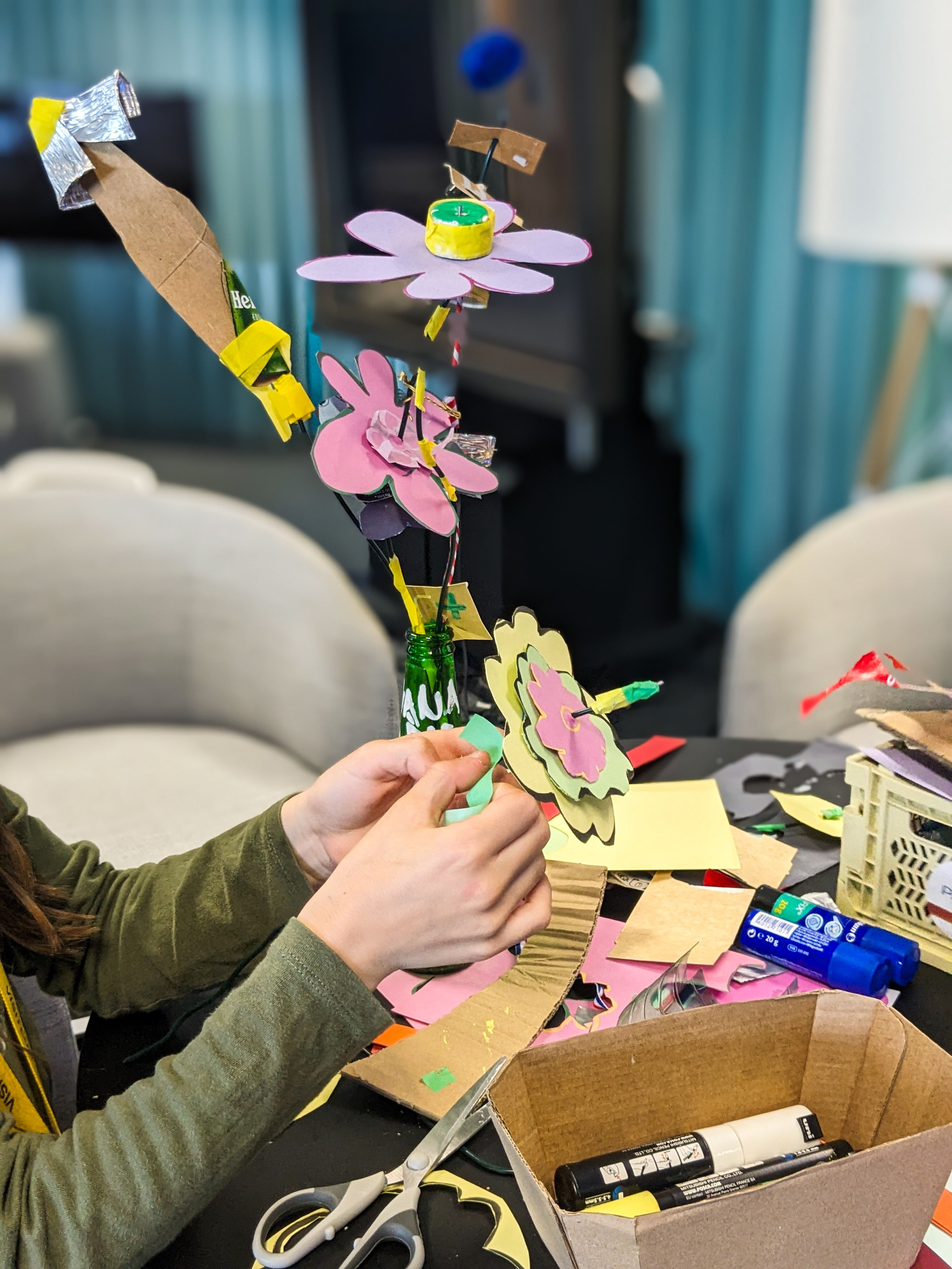 J’ai aussi collaboré avec l’entreprise Capgemini (via l’association Le Paon). Ma mission était d’animer un atelier de réemploi, destiné aux enfants des collaborateurs. L’objectif était de les sensibiliser à la seconde vie des objets en créant à partir de déchets ménagers. Je les ai invités à imaginer et fabriquer des fleurs et plantes fantastiques en utilisant les formes, couleurs et textures des emballages. En explorant ces matériaux sous un nouvel angle, ils ont découvert le potentiel créatif des objets du quotidien.