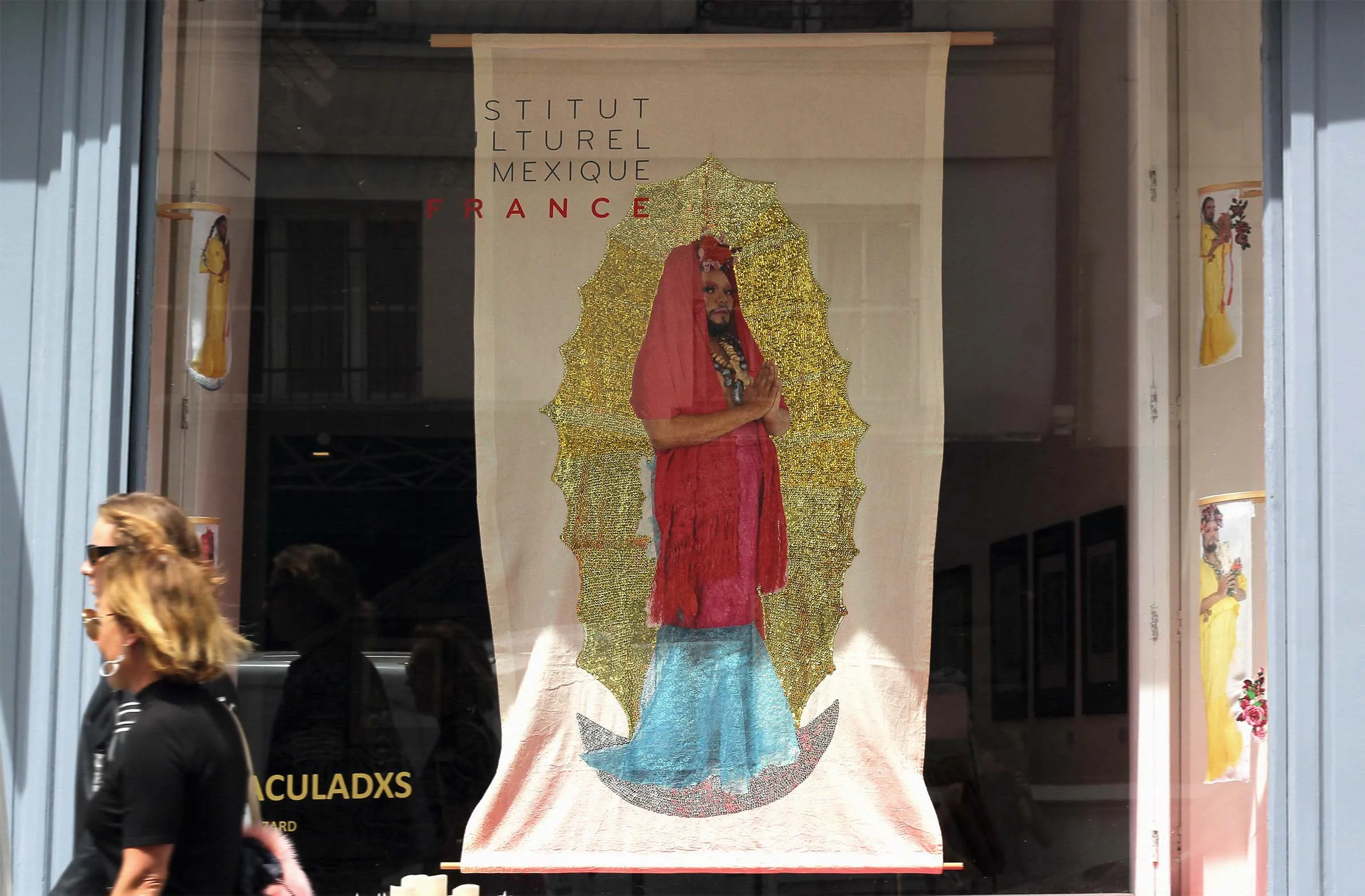 Oeuvre Inmaculadxs en vitrine de l'Institut Culturel du Mexique.