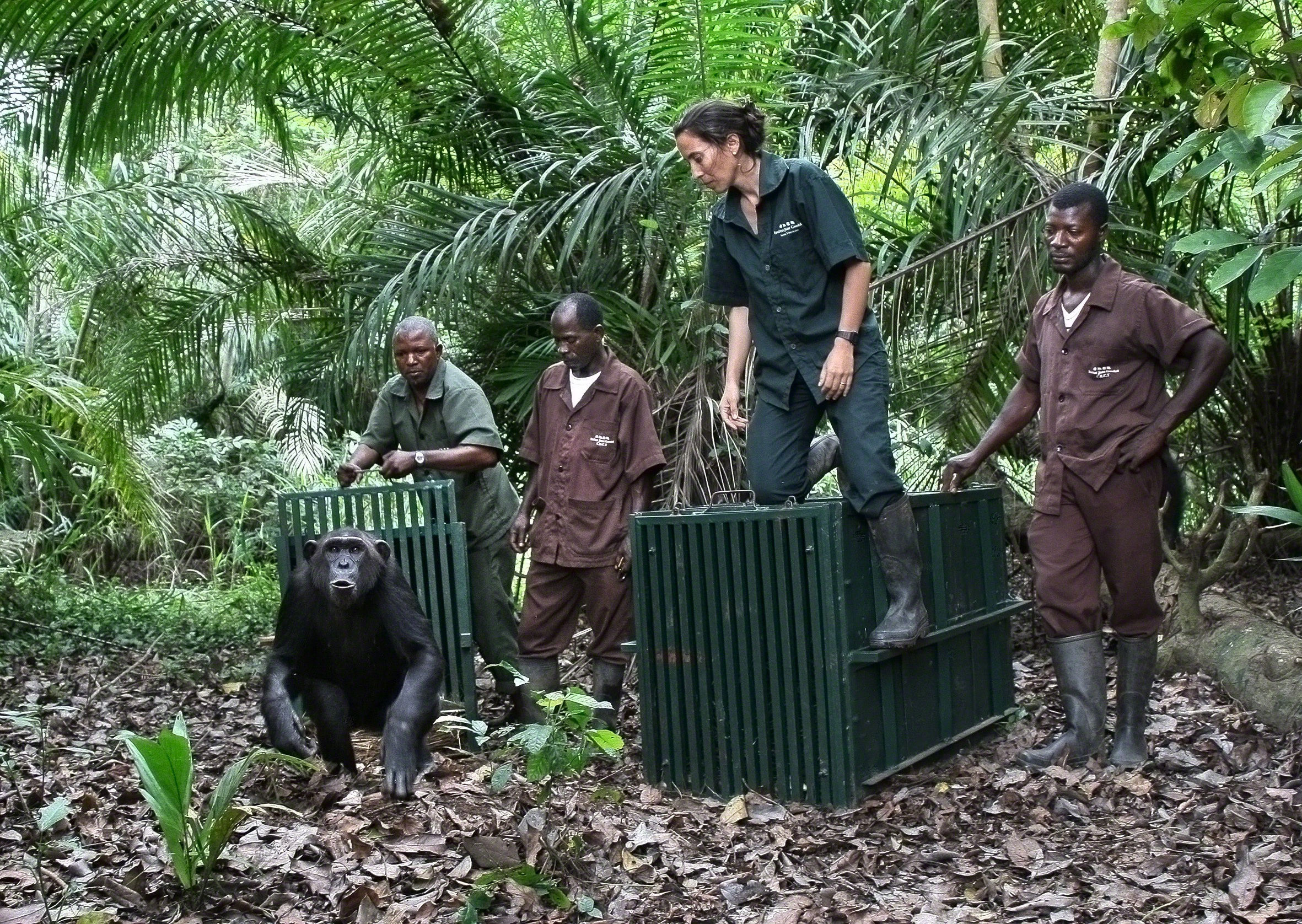 Rebeca Atencia et les gardiens libèrent la chimpanzée Louise sur l'île de Tchindzoulou Tchimpounga © the Jane Goodall Institute / Fernando Turmo